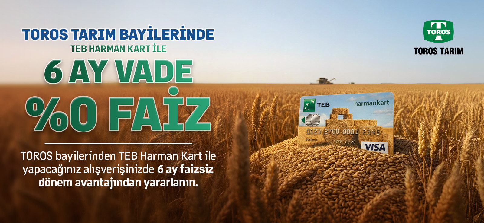 Toros Tarım bayilerinde TEB Harman Kart ile yapacağınız alışverişlerde 6 ay vade, %0 faiz avantajı sizi bekliyor.